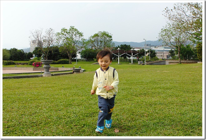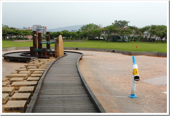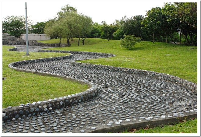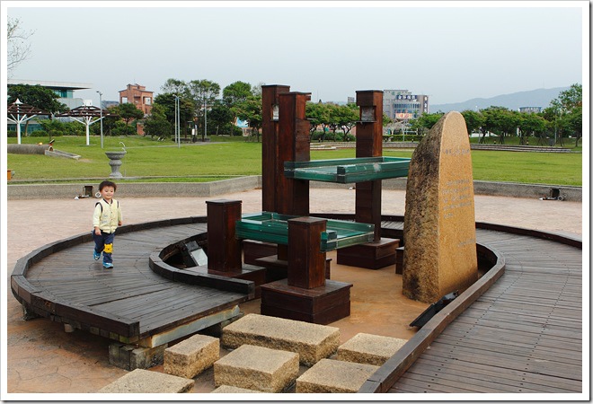 「親水遊戲區」目前雖然還沒有蓄水,小寶也繞著步道玩了起來。
