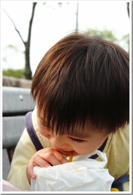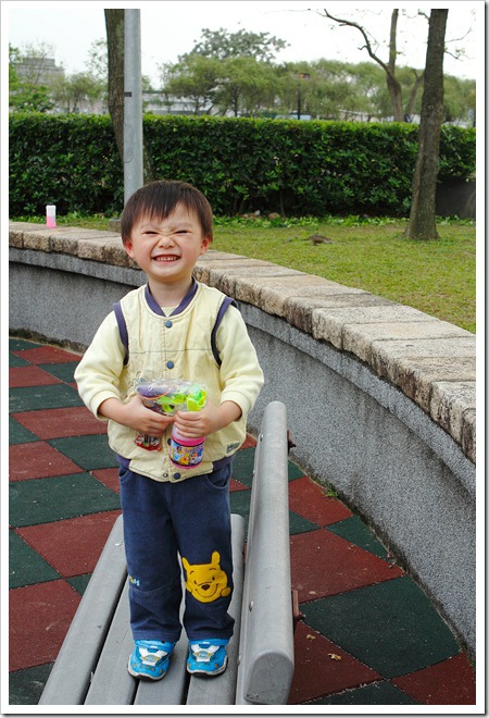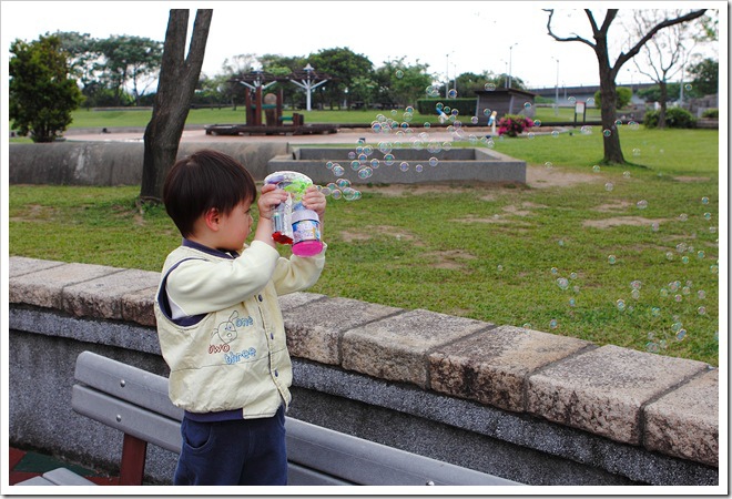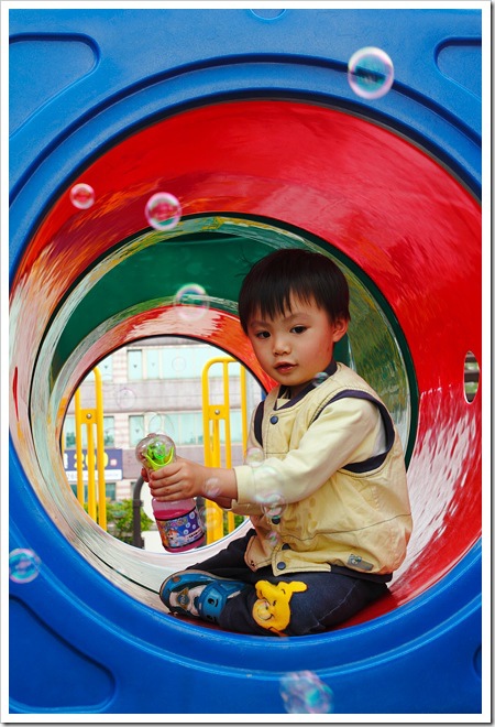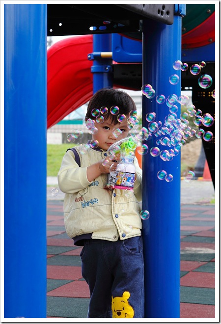 小寶玩著剛買來的電動吹泡泡機,玩得不亦樂乎。