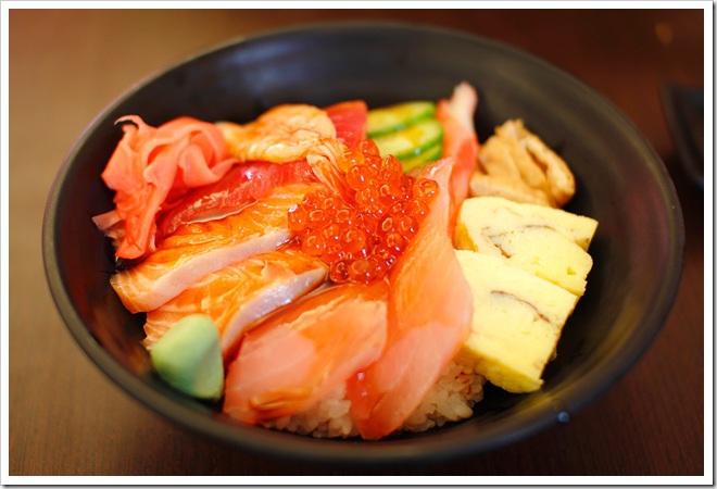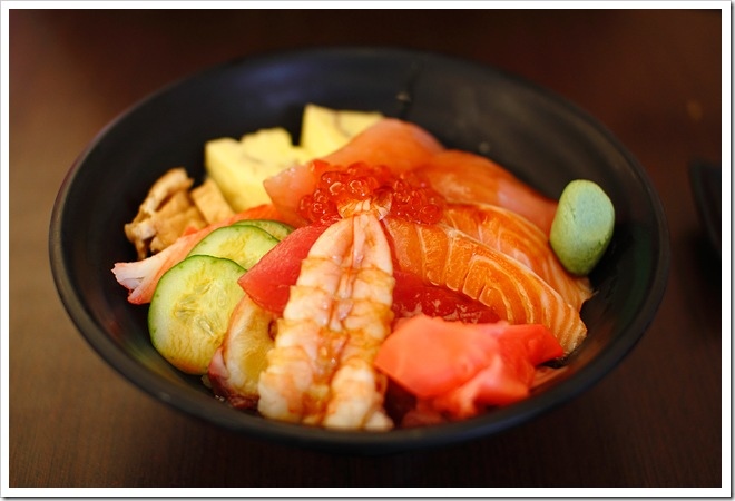 海景蓋飯內容有多種生魚片、玉子燒、小黃瓜、紅薑絲、鮮蝦、鮭魚卵、豆皮,搭配醋飯。