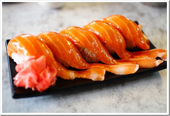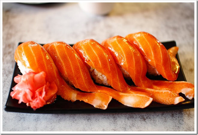 趕緊點上一份「鮭魚生魚片」以享口福,生魚片包裹著醋飯及哇沙米,並淋上些許醬汁,真是美味。