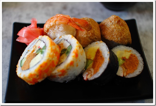 綜合卷壽司,包含花壽司、海苔壽司、豆皮壽司及蝦壽司。
