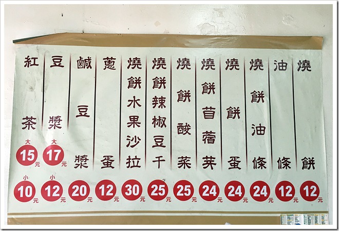 新興街燒餅店的菜單,想不到燒餅能有這麼多樣的搭配變化,真想每種都來一份。