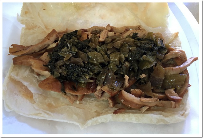 內餡為現炒的酸菜及豆干,相當有創意的搭配方式,除了基本款的油條、葱蛋搭配外,另外還有水果沙拉、苜蓿芽、辣椒豆干等吃法。