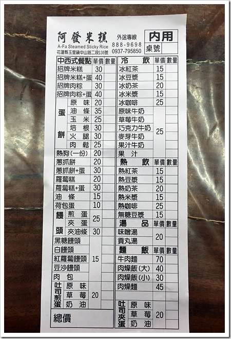 「阿發米糕」菜單,除了早點外,也有肉粽、牛肉麵及肉燥飯。