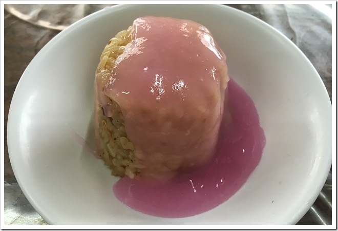 米糕的粉紅色沾醬為店家的自製甜醬,整體口味較為清淡。