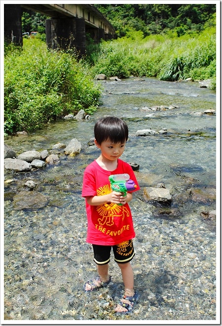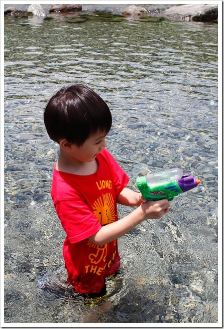 小寶帶了各式的玩水用具,開始噴起了水槍。